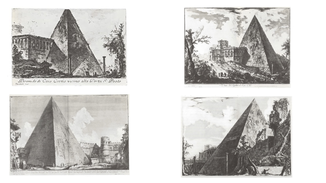 On Piranesi and the Cestius Pyramid, see “Piranesi,” in Piranesi in Rome, http://omeka.wellesley.edu/piranesi-rome/; and John Wilton-Ely, The Mind and Art of Giovanni Battista Piranesi (London: Thames and Hudson, 1978), 31–40. ↩