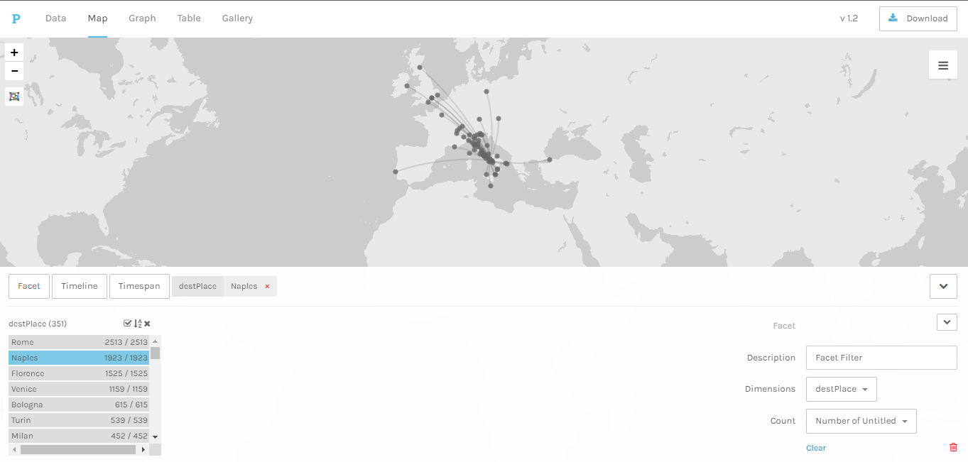 By clicking at the bottom of the page, open up the “Facet” filter and choose a selection of dimensions that interest you, including destPlace. Select only “Naples” within destPlace (fig. 103).