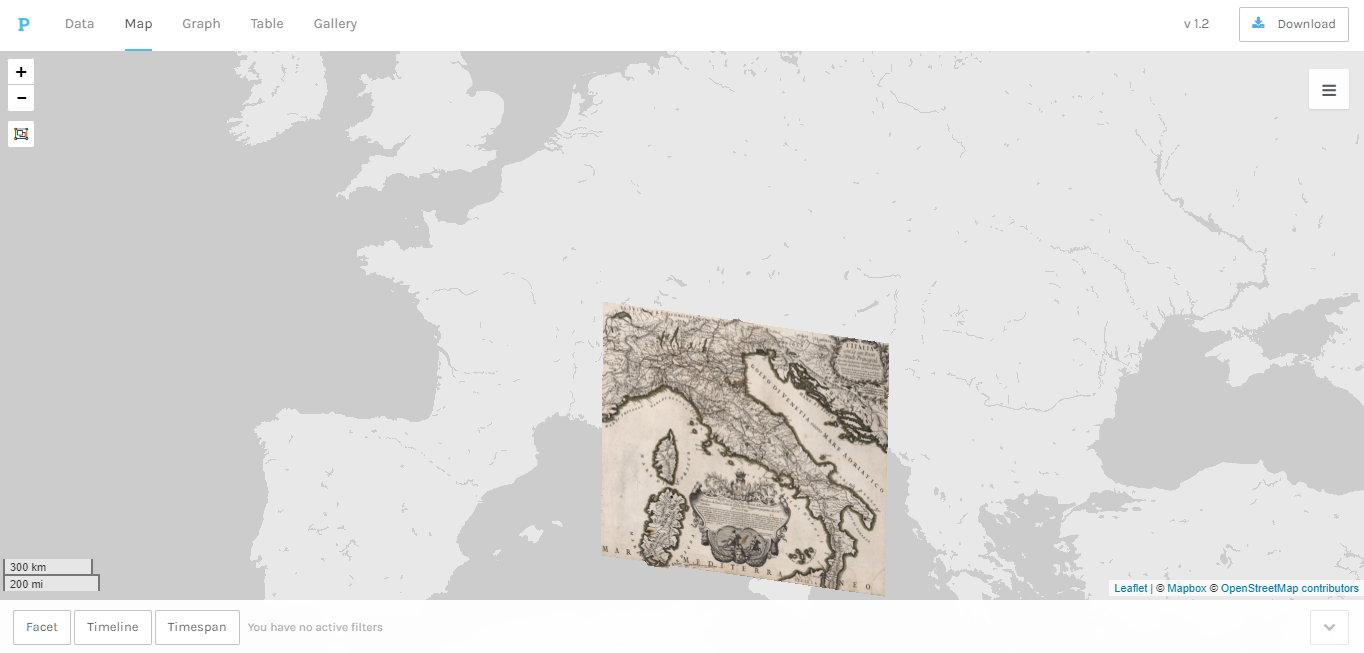 Many visualization programs will allow us to use historical maps as an additional layer for the representation of data. This could be useful, for example, for seeing if travels crossed borders that existed in history but not in the same geography as today. We could even add a previously georeferenced map as a layer to our visualizations in Palladio.