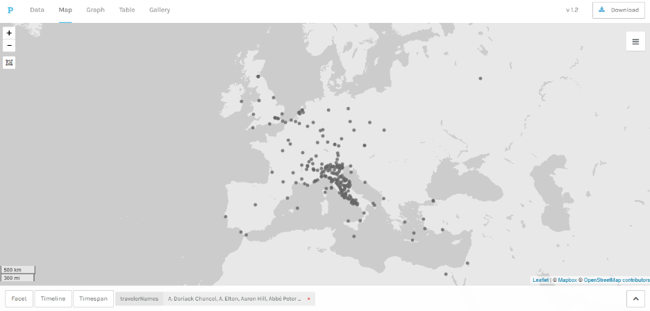 The predominant impression is that many travelers came from England into Italy, which is not especially illuminating. As always, we can use filters to render our data more legible, and we should export a JSON file before proceeding to the next step.