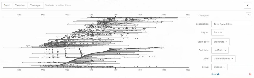 Begin by running a search in the Explorer for travelers with “Travel date” in the range of years from 1770 to 1775 (around the same time as Lady Anne Riggs Miller) (fig. 5).