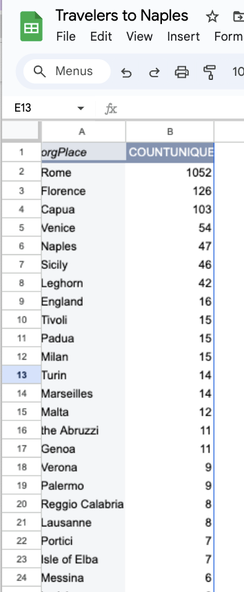 Let’s begin by searching for “everyone who traveled to Naples” and exporting the resulting data (fig. 81).