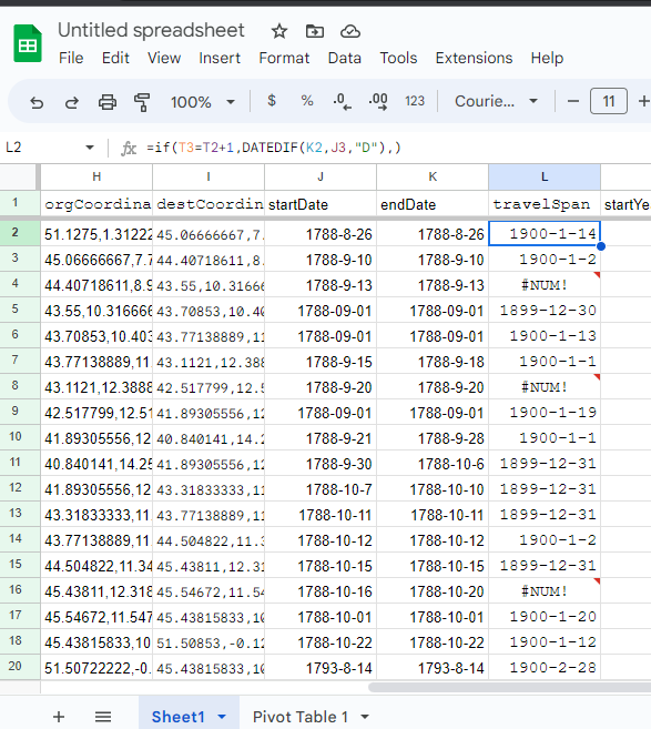 We will find that some cells in our travelSpan column have the following error: “#NUM!.” Clicking on this error suggests that our startDate value for the next location occurs before the endDate value for the last. This is because if a date is not known to the day, it is input as the first day of a given month within the Explorer data. Hence, a traveler may leave a place on September 18 and appear to arrive at the next place on September 1.