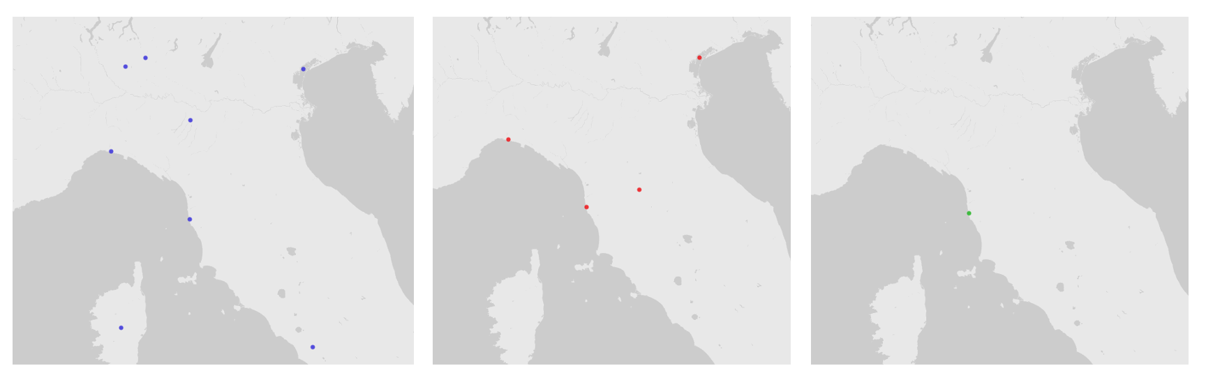 Yet, Ford, Ingamells, and their team did take note of merchants, to the extent that the second single largest category in “Employments and Identifiers” after “painter” (165 entries) is “merchant” (157 entries). And if one adds the sundry variations of the term—“textile merchant,” “timber merchant,” “oriental merchant,” and “wine merchant”—as well as other “economic” occupations such as, in “Occupations & Posts,” “banker,” “merchant banker,” “financier,” and, of course, “money lender,” in this case, the notorious John “Jew” King (1753–1823, travel years 1785–1823)—one can create a list of 180 such “economic” Grand Tourists reaching Italy from Britain during the period scrutinized by Ingamells; a similar number, incidentally, results from adding up the categories of “painter” (165), “portrait painter” (8), and “watercolourist” (4).34 Both clusters are, in any case, limited compared to the 6,007 total entries in the Explorer, some of which were cross-referenced variations of names, but sizable in relation to the 914 travelers for whom Ingamells found “Employments and Identifiers,” or even the 2,020 that we end up with if we add those with identified “Occupations & Posts.” Adopting a bird’s-eye view for the occasion, a map of all recorded travels of these individuals reveals a logical pattern.